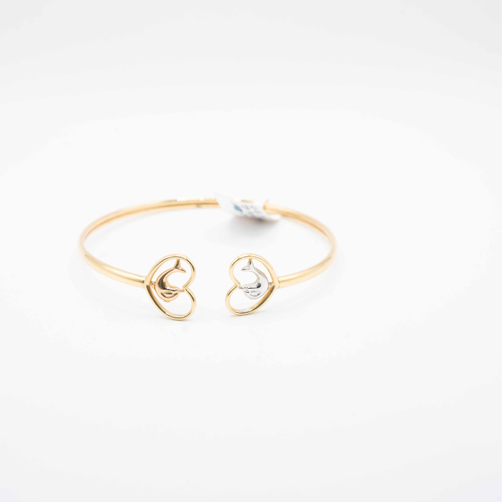 Two-Tone Dolphin Heart Bypass Bangle crafted in 18K gold, weighing 5.15 gm in Size 18. Featuring a charming dolphin-heart motif and a graceful bypass design, it offers a playful yet elegant look.